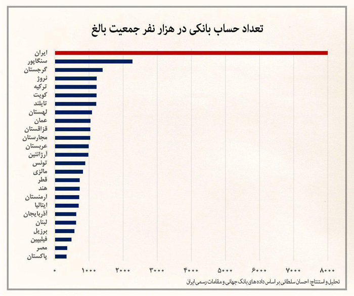 سایت خبری تحلیلی بنکر، بر اساس آمارهای در دسترس از مراجع معتبر جهانی، ایران دارای رتبه اول جهانی تعداد حساب بانکی به جمعیت بالغ در سطح جهان است.