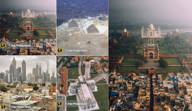 به گزارش اسپوتنیک، برای مثال تاج محل در هندوستان را اگر از نمای مختلف ببینید متوجه خواهید شد که همیشه سعی شده تا قسمت زاغه نشین آن مخفی بماند و شما تصور کنید که این مکان در وسط جنگل است.