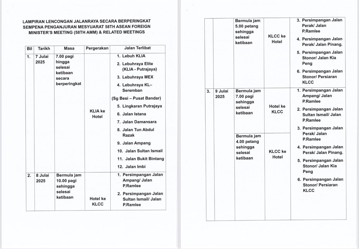 توریست مالزی – پلیس راهنمایی و رانندگی مالزی اعلام کرد که در راستای برگزاری پنجاهوهشتمین نشست وزیران خارجه آ.سه.آن و نشستهای مرتبط، برخی مسیرها در کوالالامپور و مناطق اطراف آن از ۸ تا ۱۱ جولای بهصورت مرحلهای بسته خواهند شد.