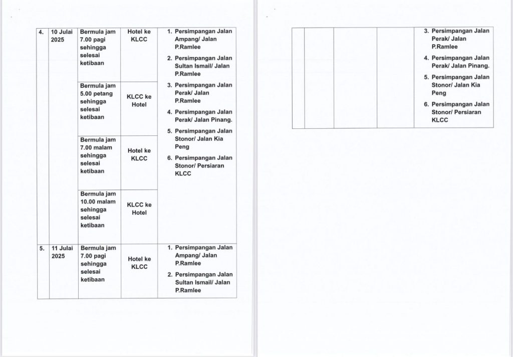 به گزارش استار، داتوک سری محمد یوسری حسن بصری، رئیس اداره تحقیقات و اجرای ترافیک بوکیت امان، در بیانیهای اعلام کرد که این محدودیتها شامل سه بزرگراه و ۱۵ مسیر اصلی در کلانگ ولی خواهد بود. همچنین تمرینهای شبیهسازی برای حرکت کاروانهای رسمی از فرودگاهها به هتلها و مرکز همایشهای کوالالامپور (KLCC) از ۴ تا ۶ جولای با حضور ۳۹۱ مأمور پلیس راهنمایی و رانندگی انجام خواهد شد.