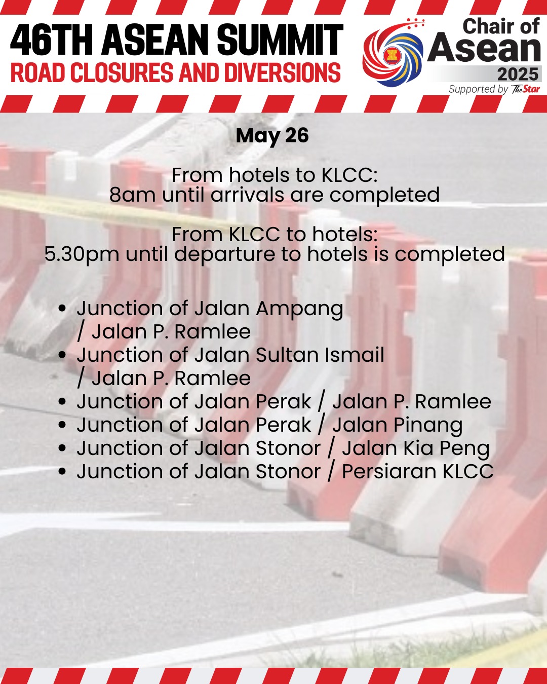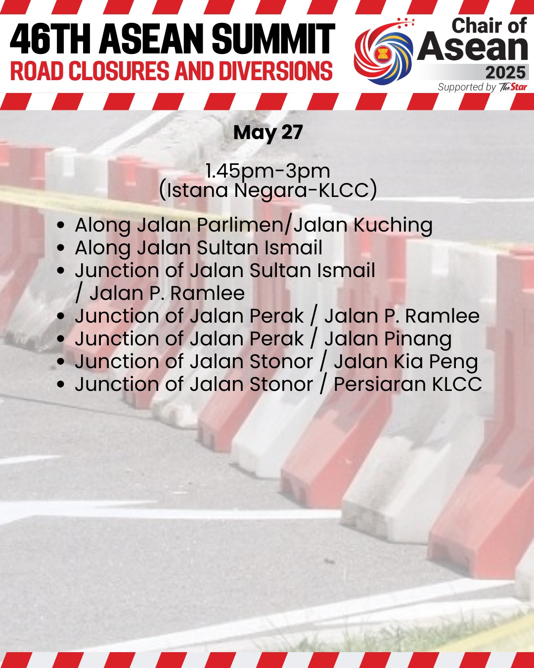 به گزارش نیواستریتس تایمز، محمد یوسری حسن بصری، مدیر دپارتمان تحقیقات و اجرای قوانین ترافیکی پلیس بوکیت امان، گفت که این بسته شدنها بر اساس حرکت کاروانهای رسمی و نیازهای امنیتی تنظیم میشود. او اضافه کرد که این محدودیتها از ساعت ۷:۳۰ صبح تا ۸ شب ادامه خواهد داشت.