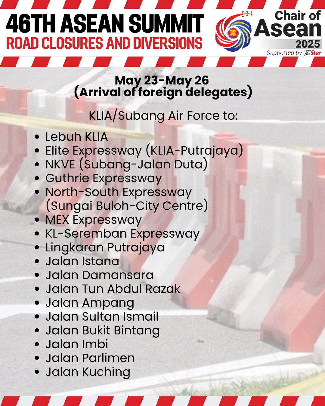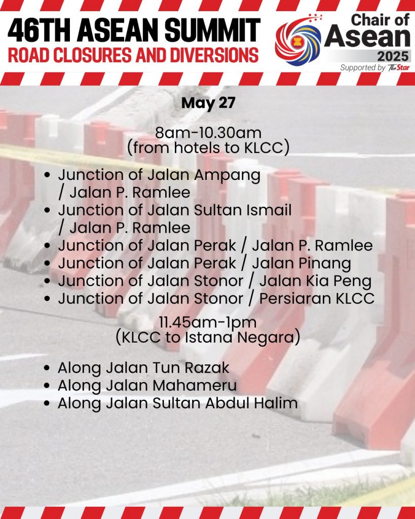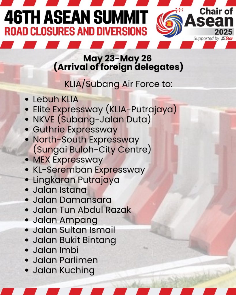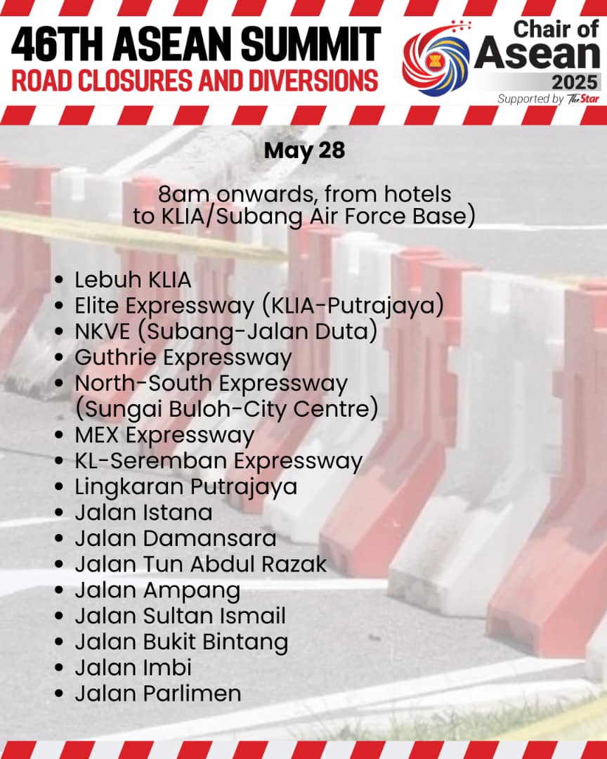 توریست مالزی – پلیس مالزی اعلام کرد که شش بزرگراه و ۲۵ جاده اصلی در منطقه کلانگ ولی به صورت مرحلهای از ۲۳ تا ۲۸ می برای برگزاری چهل و ششمین اجلاس آسهآن بسته یا منحرف خواهند شد.