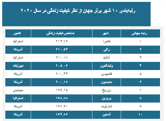 در میان پایتختهای موجود در این بررسی، کاراکاس مرکز ونزوئلا در انتهای فهرست ۲۲۷ شهر جهان قرار گرفته است. شاخص تهران در ارزیابی ۵۴.۷۳ است، در حالی که شاخص کیفیت زندگی در شهر نخست این رتبه بندی یعنی کانبرا ۲۱۳.۷۹ است.