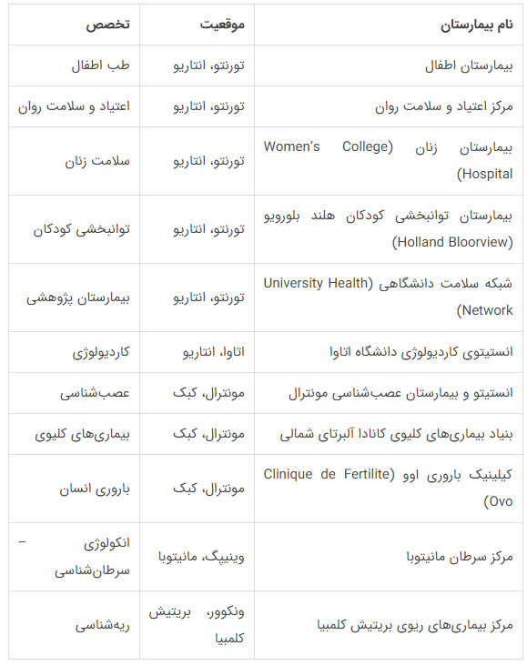 جدول زیر برخی از بهترین مؤسسات درمانهای خاص در ایالتهای کانادا را نشان میدهد: