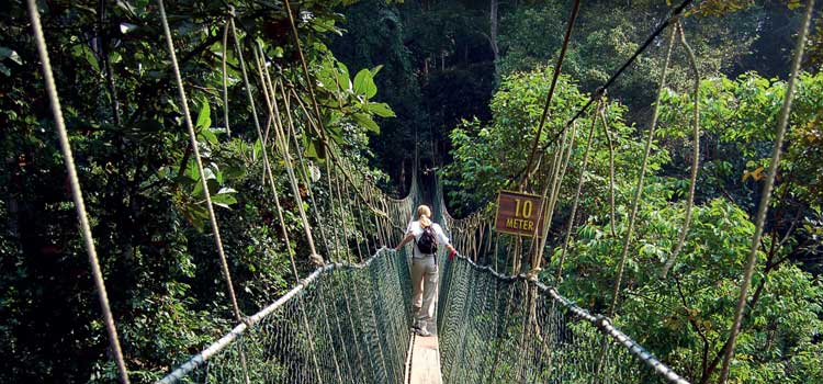 برای کسانی که بار اول به مالزی سفر میکنند یکی از لذتبخشترین قسمتهای گردش در پارک ملی تامان نگارا در رشتهکوه Titiwangsa، قدم زدن در طولانیترین پل معلق (canopy walkway) دنیا است. این پل ۵۳۰ متر طول و ۴۰ متر از زمین ارتفاع دارد. اگر ماجراجو هستید و دوست دارید هیجان بیشتری را تجربه کنید، شب را برای قدم زدن در جنگل انتخاب کنید و از دیدن حیوانات شبزندهدار در دل طبیعت لذت ببرید.