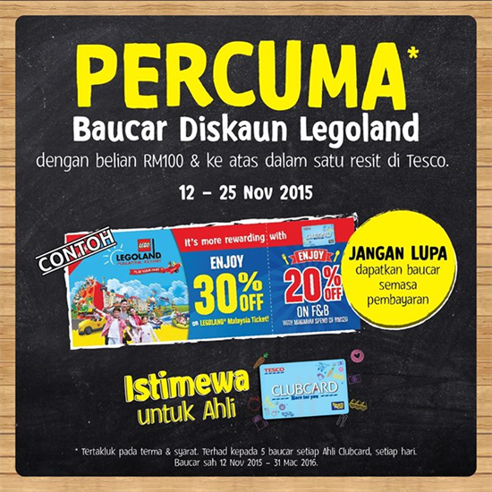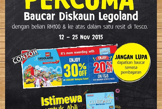 مشتریانی که کارت عضویت فروشگاه تسکو را دارند میتوانند تا تاریخ ۲۵ نوامبر ۲۰۱۵ با خرید حداقل ۱۰۰ رینگت از هر یک از شعب این فروشگاه, کوپن های تخفیف ویژه ای را دریافت نمایند و با استفاده از آنها از ۳۰ درصد تخفیف در زمان خرید بلیت شهربازی LEGOLAND بهره مند شوند.