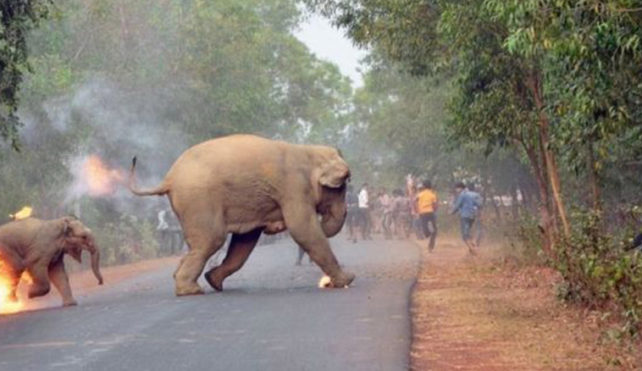 در عکسی که بیپلب هزرا گرفته یک بچه فیل در حالی که قسمت پشت بدنش آتش گرفته دیده می شود که به دنبال یک فیل بزرگسال در حال عبور از جاده و فرار از آتشاند. این عکس در بخش بنگال غربی گرفته شده که روابط میان ساکنان محلی و فیلها خوب نیست.