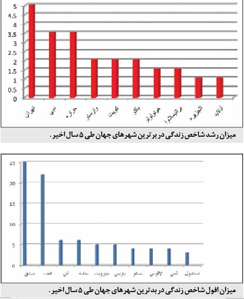 این درحالی است که ملبورن استرالیا، وین اتریش، ونکوور، تورنتو و کلگری کانادا هم در این گزارش در ردههای بالا قرار دارند اما هیچیک به سرعت تهران نتوانستهاند کیفیت زندگی را طی ۵سال افزایش دهند. اکونومیست در ارزیابی خود از کیفیت شهرهای جهان به ثبات، بهداشت، فرهنگ، محیطزیست، آموزش و زیرساختهای شهری نمره داده است.