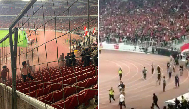 به گزارش بانک ورزش وبه نقل از سایت فاکس اسپورت آسیا، در دقیقه ۷۵ بازی، داور سوت توقف را به صدا درآورد و پس از ۵ تا ۷ دقیقه بازی از سر گرفته شد. بر این اساس، چند هوادار اندونزیایی سعی کردند وارد جایگاه هواداران مالزیایی شوند و این موضوع با درگیری روبرو شد.