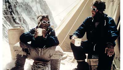 تنزینگ نورگی ، سمت چپ و ادموند هیلاری موفقیت خود را با یک لیوان چای بعد از فتح قله در اردوگاه شماره ی چهار جشن گرفتند و به اقوام خود تسلی خاطر دادند. بافت چادر آنها مثل کتان و نایلون که در پشت دیده می شود. امروزه کوهنوردان احتمالا” از نوشیدنی های انرژی زا یا پروتئین دار برای تقویت قوای جسمانی خود استفاده می کنند. اگرچه چای داغ همچنان یک نوشیدنی محبوب بین اعضای تیم کوهنوردی است. آنها در چادرهای فوق سبک و کیسه خوابهای سبک خود می خوابند و اسنک مقوی خود را می خورند.