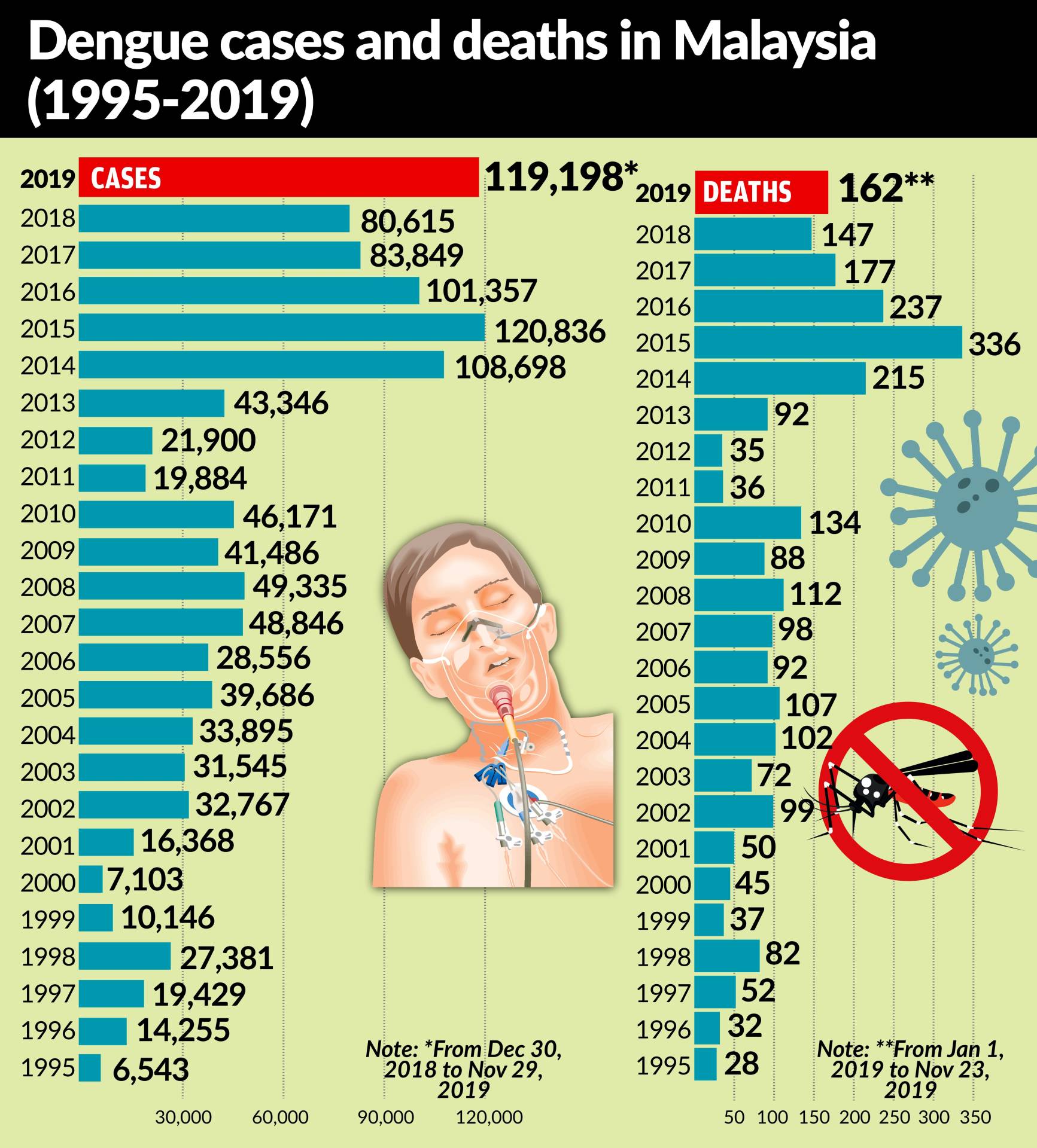 آخرین آمار را می توانید در وب سایت iDengue که توسط وزارت بهداشت با همکاری آژانس ملی فضایی اداره می شود ببینید. در این وب سایت اطلاعاتی در مورد نقاط داغ ، اقدامات پیشگیرانه و شماره تماس اطلاع رسانی در هر ایالت ارائه شده است.