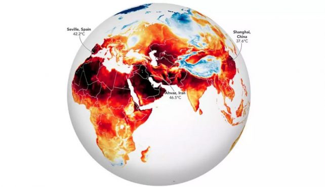 طبق گزارش ناسا، دما در ماه ژوئیه در ایران پس از آنکه در ماه پیش از آن تا ۵۲ درجه بالا رفت همچنان بالا مانده است. از سوی دیگر دمای هوا در اوایل هفته گذشته در بخشهایی از عراق، ایران و کویت افزایش یافته است. از دوشنبه گذشته بخشهایی از عراق، ایران و کویت دمای بیش از ۵۰ درجه را تجربه کردند. شهر آبان ایران روز دوشنبه گذشته دمای ۵۲.۲ درجه را ثبت کرد. این شهر جنوبی ایران در آخرین ماه بهار نیز چنین دمایی را به خود دیده بود که رکورد ۷۰ ساله دمای خرداد ماه در این شهر شکسته شد.