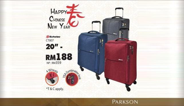 توریست مالزی – پارکسون مالزی به مناسبت سال نو چینی چمدان های مسافرتی برند Echolac و دیگر برندها را از RM188 به حراج گذاشته است.