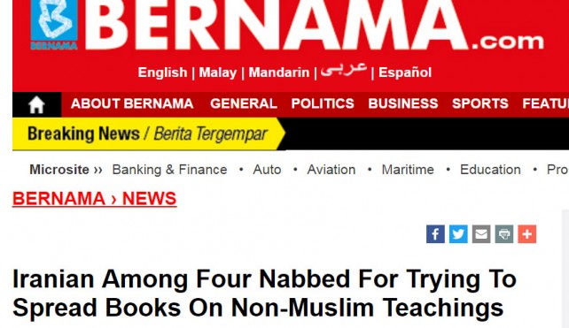 دپارتمان امور اسلامی ملاکا از دستگیری یک ایرانی به همراه سه نفر دیگر به جرم تلاش برای توسعه و ترویج آموزههای غیر اسلامی خبر داد.