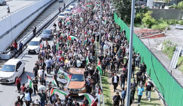 این تجمع که از مقابل مرکز خرید The Linc KL در جالان تون رزاک آغاز شد، با راهپیمایی شرکت‌کنندگان به سمت سفارت همراه بود؛ آن‌ها پلاکاردهایی با شعار «مرگ بر اسرائیل» و «نه به صهیونیسم» حمل می‌کردند و شعار «آزادی برای فلسطین» سر می‌دادند. پلیس برای پیشگیری از هرگونه حادثه، مسیرهای منتهی به سفارت را مسدود کرده و در مقابل ساختمان ALPS ایست‌های بازرسی ایجاد کرده بود، اما جمعیت در نهایت توانست خود را تا نزدیکی محوطه سفارت برساند.