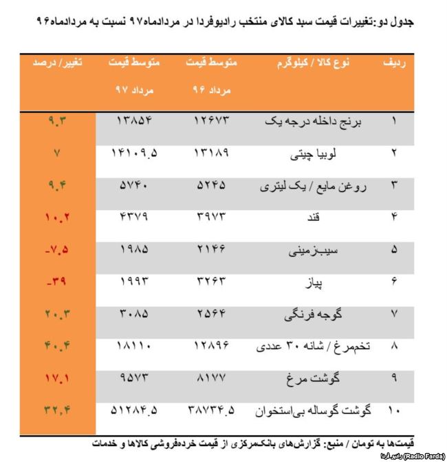 بررسی تغییرات قیمت ده قلم کالای مندرج در سبد منتخب کالاهای رادیوفردا نیز، نشان می‌دهد که روند عمومی افزایش قیمت‌ها، این کالاهای پرمصرف در سبد غذایی خانوارهای ایرانی را تحت تاثیر قرار داده‌ است.بر اساس این بررسی که ماهانه انجام می‌گیرد، در مردادماه امسال نسبت به ماه قبل و مردادماه پارسال، بیشترین رشد قیمتی مربوط به گوشت مرغ، گوشت گوساله و تخم مرغ بوده است.