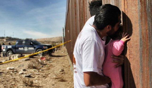 مردی فرزندش را کنار دیوار مرزی آمریکا و مکزیک نگه داشته است. در روز جهانی حقوق بشر خانوادههایی که مرز آنها را جدا کرده به مدت چند دقیقه از خلال حصار با هم دیدار کردند.