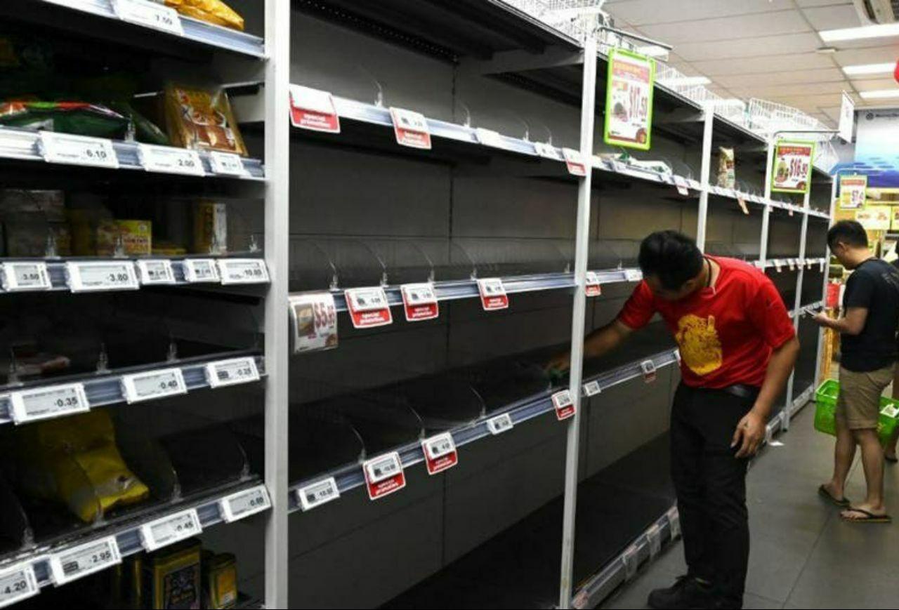 مشتریان مضطرب سنگاپور پس از شیوع بیشتر کرونا در این منطقه برای خرید مواد غذایی صف کشیدند و تمام اجناس و موادغذایی فروشگاهها را خریدند.