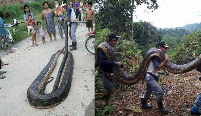 توریست مالزی دو مار پیتون غول پیکر در منطقه جنگلی بورنئوی مالزی در نزدیکی روستای «بینتولو» شکار روستاییان شدند.