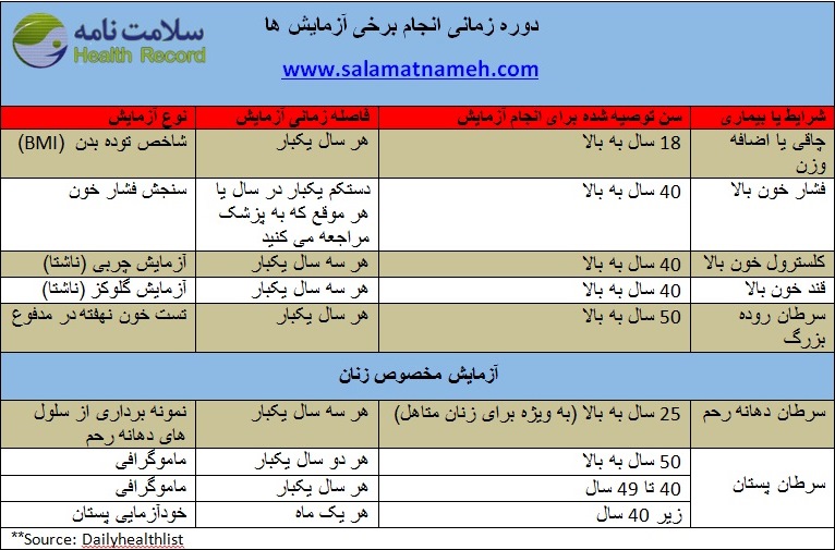 افرادی که به سن بلوغ و دوران پس از ۳۵ سالگی می رسند، نیاز است به صورت سالانه به پزشک مراجعه نمایند. اما در برخی شرایط وجود برخی بیماری های جزئی از قبیل فشار خون نسبتا بالا، یا بیماری های پیچیده تری از قبیل سرطان ممکن است نیاز به مراجعه به پزشک را افزایش دهد. در جدول زیر فاصله زمانی انجام برخی آزمایش ها ذکر شده است.