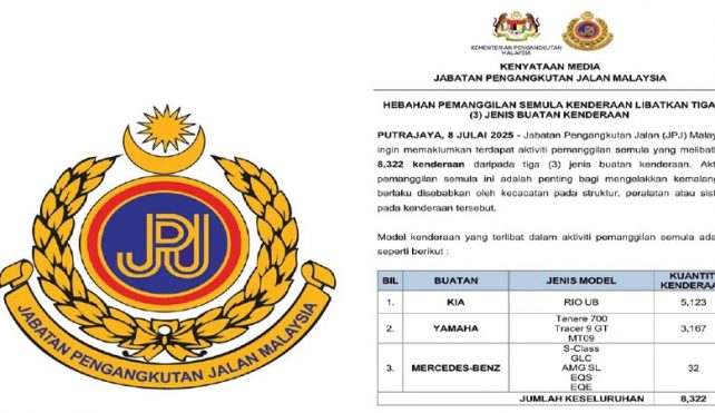 توریست مالزی – اداره حملونقل جادهای مالزی (RTD) فراخوانی برای ۸۳۲۲ وسیله نقلیه از سه شرکت کیا، یاماها و مرسدسبنز صادر کرده است. این فراخوان به دلیل نقصهای ایمنی مختلفی انجام شده که ممکن است برای رانندگان و کاربران جاده خطرآفرین باشد.