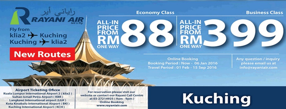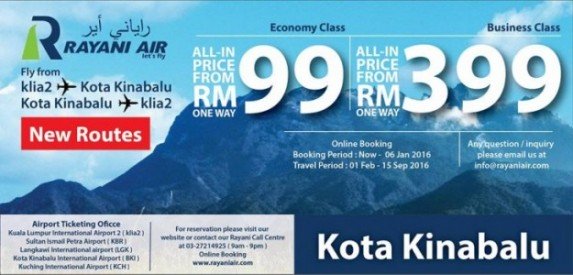 رایانی ایر, اولین هواپیمایی اسلامی مالزی از تاریخ ۳۰ دسامبر ۲۰۱۵ فروش ویژه بلیت های خود برای مسیر های جدید این خط هوایی آغاز کرده است.