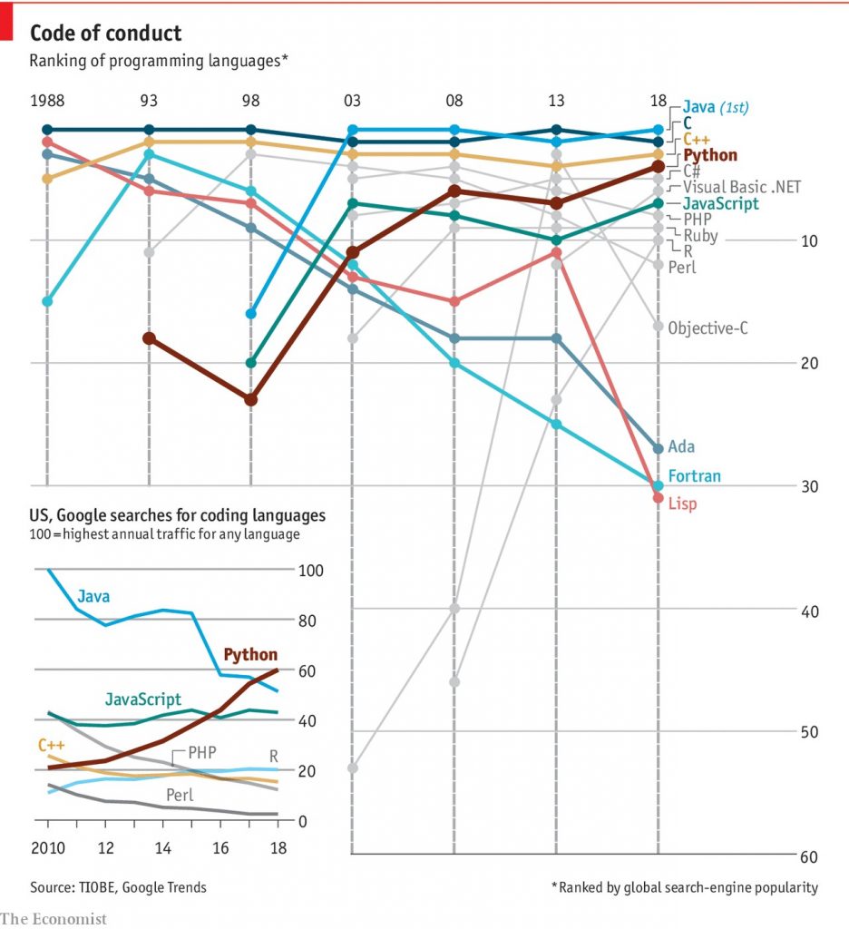 اکونومیست با این نمودار نشان داد که چگونه زبان برنامهنویسی پایتون، تقریبا در حال کنار زدن همه رقبای خود بوده و حرفه برنامه نویسی را متداولتر کردهاست. این اتفاق به دلیل داشتن دو مزیت اصلی این زبان یعنی ساده بودن و انعطافپذیری آن است. به گزارش اکونومیست، سی آیای هم از آن برای هک کردن صفحات وب سایتها و شرکت پیکسار برای تولید فیلمها استفاده میکند.