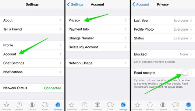 وجود تیک آبی در پیامها مخاطبان شما را آگاه میکنند که پیامشان را خواندهاید. بنابراین اگر میخواهید پیام آنها را بخوانید بدون اینکه بدانند، اپلیکیشن واتساپ را باز کنید، به بخش (account) و سپس (privacy) بروید و گزینه read receipts را لغو کنید. البته با غیرفعال کردن این گزینه، اگر پیامی برای دوستان خود بفرستید هم از خوانده شدن یا نشدن آن آگاه نخواهید شد.