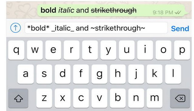 قالببندی متن یکی از جدیدترین قابلیتهایی است که به این اپلیکیشن افزوده شده است و به کاربران این امکان را میدهد که با قرار دادن پیام خود در دو ستاره (*) پیام خود را بولد کنند، همچنین با قرار گرفتن پیام در دو علامت (_) متن ایتالیک شده و با قرار گرفتن در بین دو (˜) متن خطدار میشود.