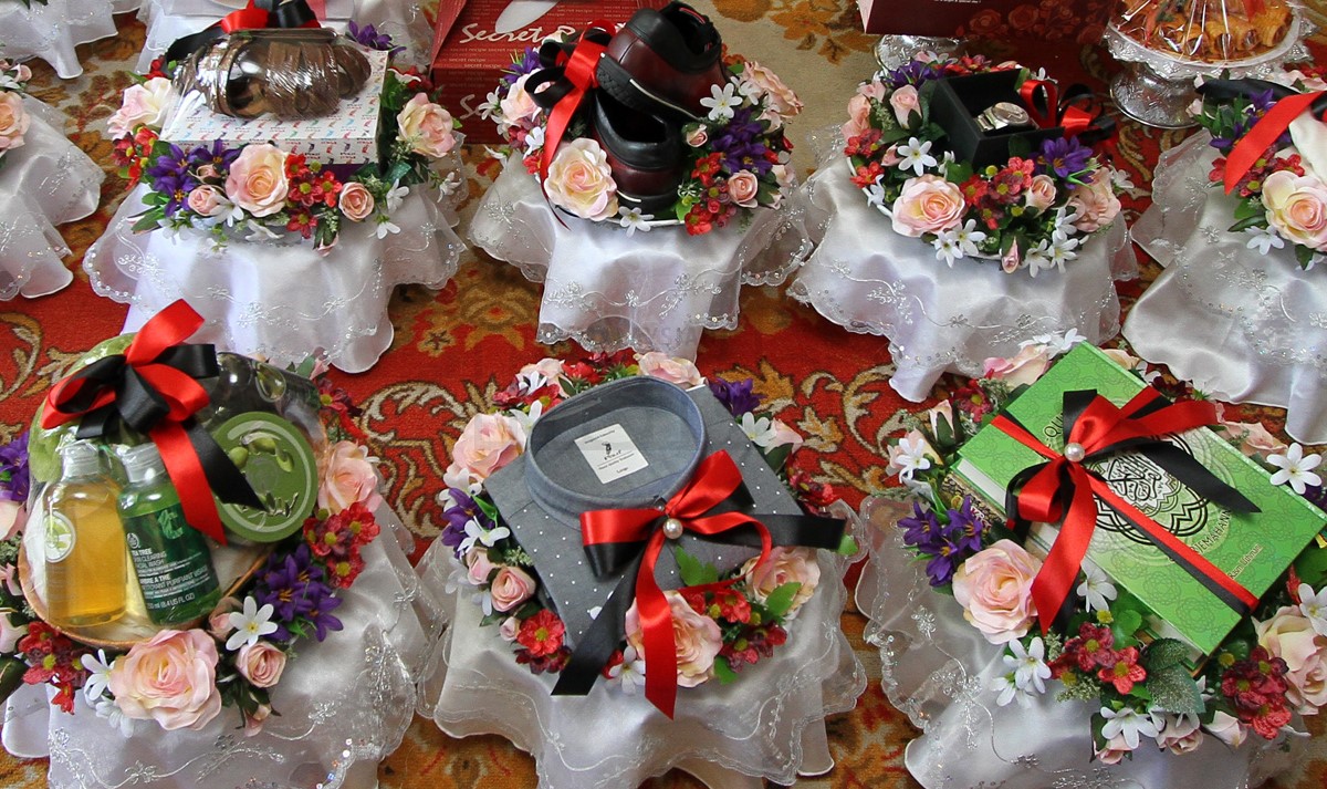 در روز جشن نامزدی خانواده داماد هدایای تعیین شده را درسبد ها و سینی های گل زده به خانه عروس می آورند. همه این هدایا به جز حلقه ازدواج در سفره ای زیبا چیده می شود. حلقه طلا معمولا طی مراسمی توسط خاله یا خواهر بزرگتر داماد به عروس اهدا میشود. سپس خانواده عروس از میهمانان پذیرایی کرده و درآخر کادوهای داماد را به نمایندگان آنها اهدا میکنند.