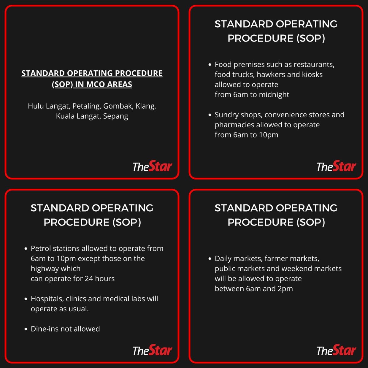 ‘ایستگاه های بنزین مجاز به کار از ساعت ۶ صبح تا ۱۰ شب به غیر از ایستگاه های بزرگراه هستند که می توانند به مدت ۲۴ ساعت کار کنند. بیمارستان ها، کلینیک ها و آزمایشگاه های پزشکی به طور معمول کار خواهند کرد. بازارهای روزانه، بازارهای کشاورزان، بازارهای عمومی و بازارهای آخر هفته از ساعت ۶ صبح تا ۲ بعدازظهر مجاز به فعالیت هستند. بازارهای ماه رمضان همچنان تحت SOP سختگیرانه مجاز به فعالیت هستند.