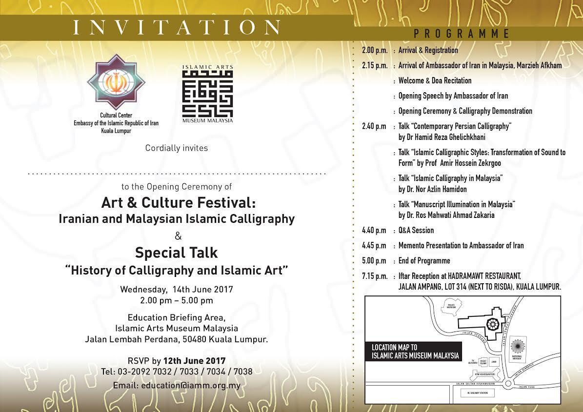 توریست مالزی- نمایشگاه هنر و فرهنگ با موضوعیت هنر خطاطی اسلامی ایرانی و مالزیایی با حضور سفیر ایران برگزار میشود. این نمایشگاه با تلاوت قران و سخنرانی سفیر ایران در مالزی آغاز شده و در پایان از میهمانان برای صرف افطار در رستوران HADRAMAWT پذیرایی خواهد شد.