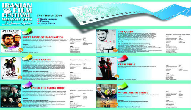 سابقی گفت : زیرسقف دودی به کارگردانی( پوران درخشنده) ، طعم شیرین خیال ( کمال تبریزی) ، رخ دیوانه (ابوالحسن داودی)، ملکه (محمدعلی باشه آهنگر)، آتش بس ۲ (تهمینه میلانی) و کفش هایم کو(کیومرث پوراحمد)، ۶ فیلم سینمای ایران هستند که در روزهای ۷ تا۱۷ مارس (۲۶ تا ۲۶ اسفند) در مالزی به نمایش درمی آیند.