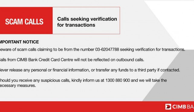 بانک CIMB تاکید کرده است که مردم به هنگام تماسهای اینچنینی نباید به هیچ عنوان اطلاعات شخصی و مالی خود را به طرف مقابل اعلام کنند.