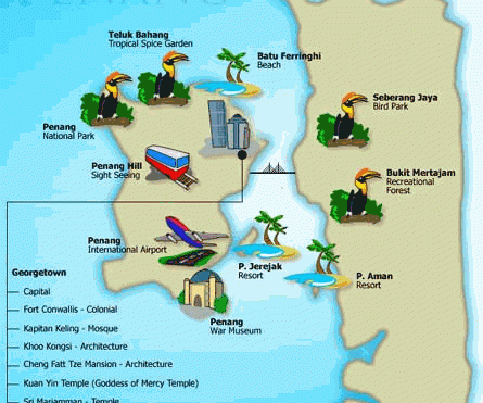ایالت پنانگ از دو قسمت تشکیل شده است که یکی جزیره پنانگ و دیگری سبرانگ پرای (Seberang Perai) است. جزیره پنانگ محل استقرار دولت محلی این ایالت است و با توجه به پیشرفتهای صورت گرفته دراین جزیره گفته میشود که پنانگ یکی از توسعهیافته ترین مناطق مالزی است.
