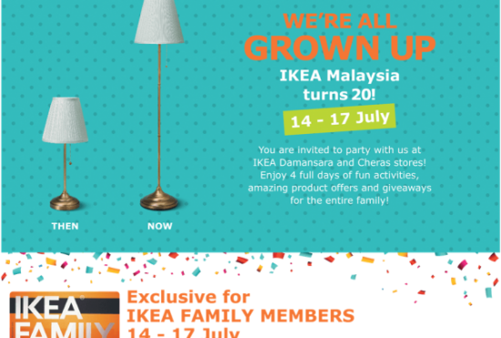 فروشگاه لوازم خانگی سوئدی IKEA تولد ۲۰ سالگی خود در مالزی را جشن می گیرد. مرکز فروش لوازم خانگی آیکیا IKEA دو شعبه در شهر کوالالامپور مالزی دارد که نه تنها به دلیل دارا بودن کیفیت مبلمان که به دلیل کیفیت رستوران آن نیز مشهور است. این دو شعبه طی روزهای ۱۴ تا ۱۷ جولای تولد ۲۰ سالگی شعبات مالزی را با تخفیفهای ویژه جشن خواهند گرفت.
