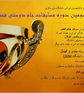 ۱۴ بهمن ۱۳۹۴مراسم اختتامیه سومین دوره مسابقات جام دوستی فجر برگزار میشود. سومین دوره مسابقات جام دوستی فجر به همت رایزنی علمی و انجمن دانشجویان ایرانی دانشگاه ملی مالزی در حال برگزاری است و مراسم اختتامیه آن فردا... -