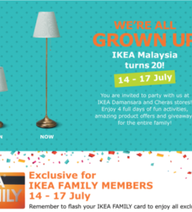IKEA به مناسبت تولد ۲۰ سالگی از ۱۴ تا ۱۷ جولای ۲۰۱۶ برنامه و تخفیفهای ویژه برگزار میکند. فروشگاه لوازم خانگی سوئدی IKEA تولد ۲۰ سالگی خود در مالزی را جشن می گیرد. مرکز فروش لوازم...