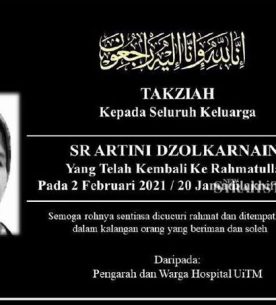 ۱۵ بهمن ۱۳۹۹توریست مالزی – در یک پست فیس بوکی دانشکده پزشکی UiTM، آرتینی دیروز در ساعت ۵.۳۰ صبح در بیمارستان UiTM درگذشت. به گزارش نیواستریت تایمز، پرستاری که پنجمین فرزند خود را باردار بود در اثر عوارض... -